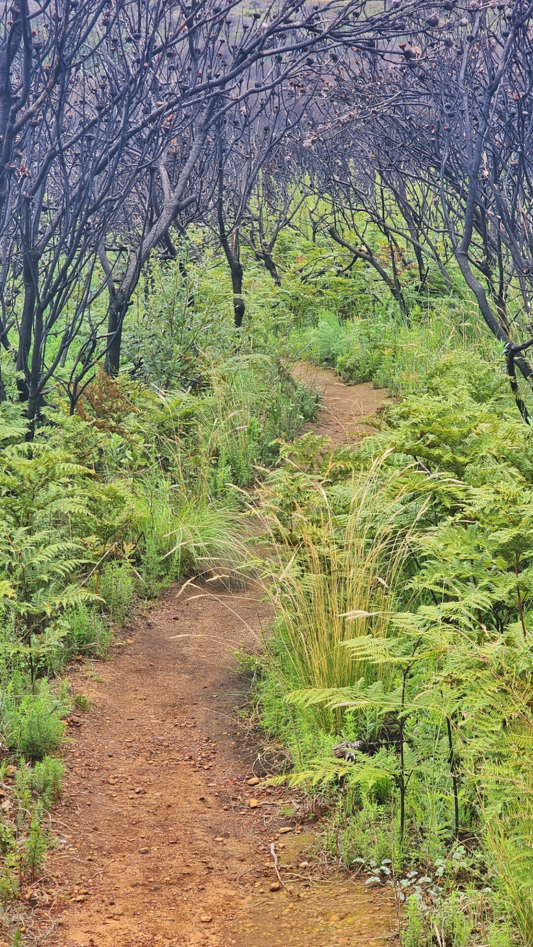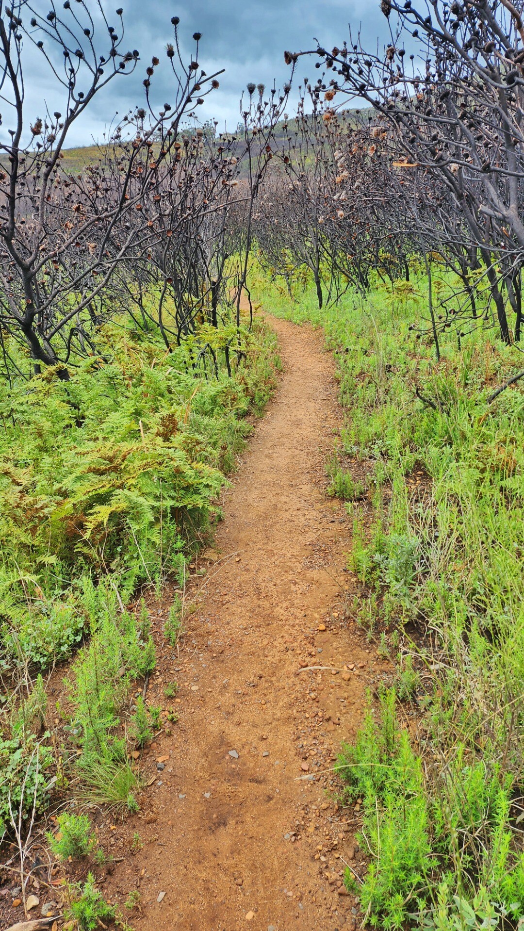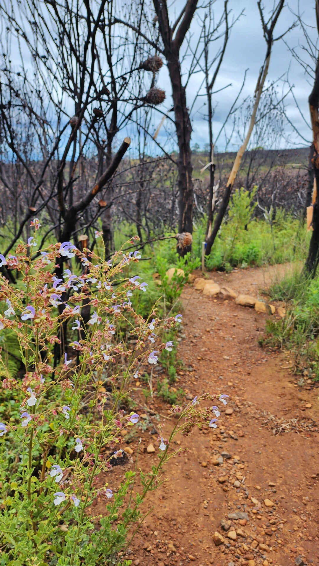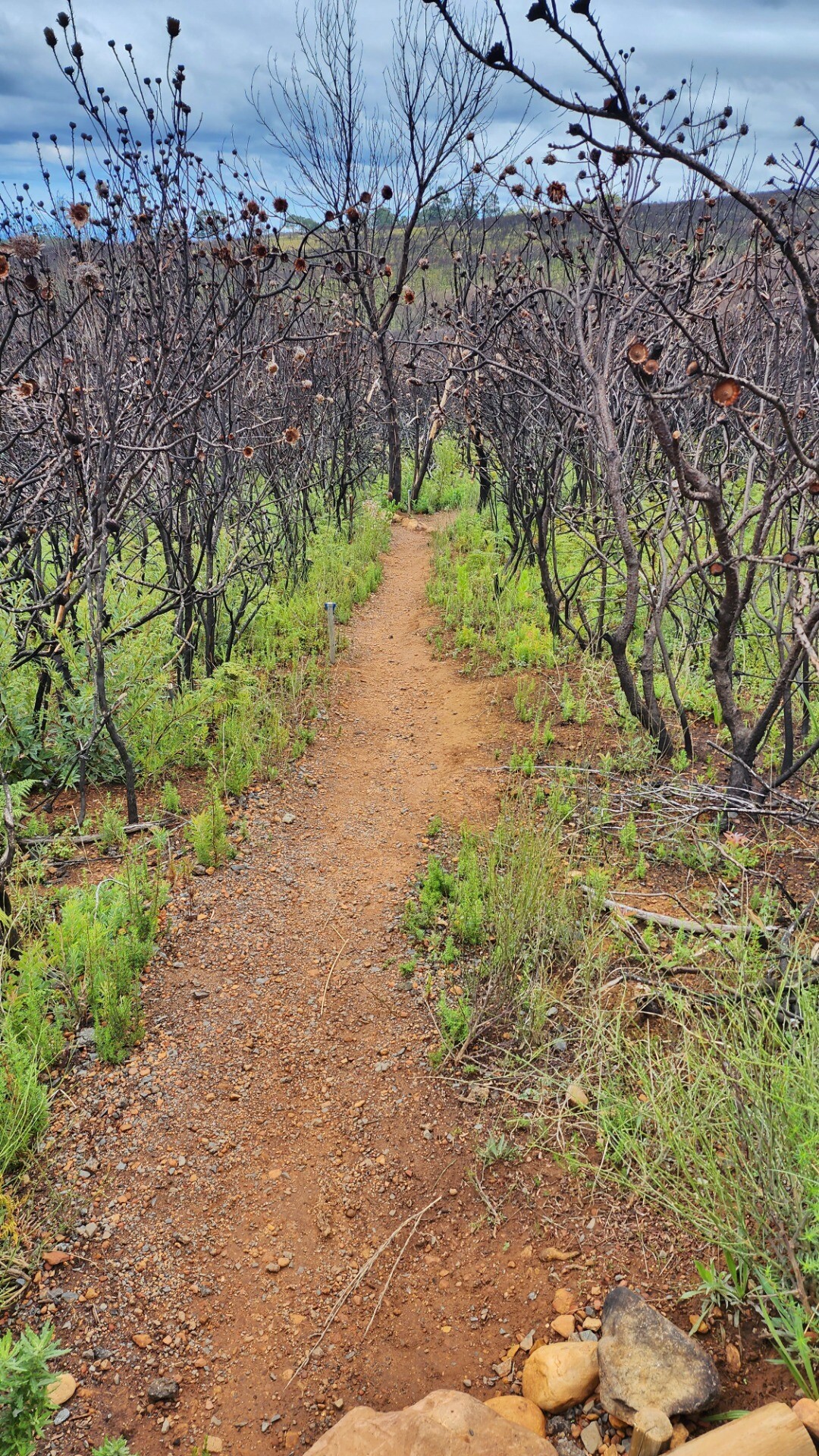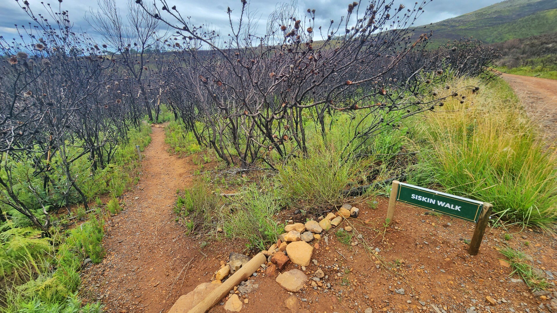 It was pretty cool seeing the black burned trunks agains the bright new growth. A lot of the new bushes are proteas that will grow to replace the burned ones.
