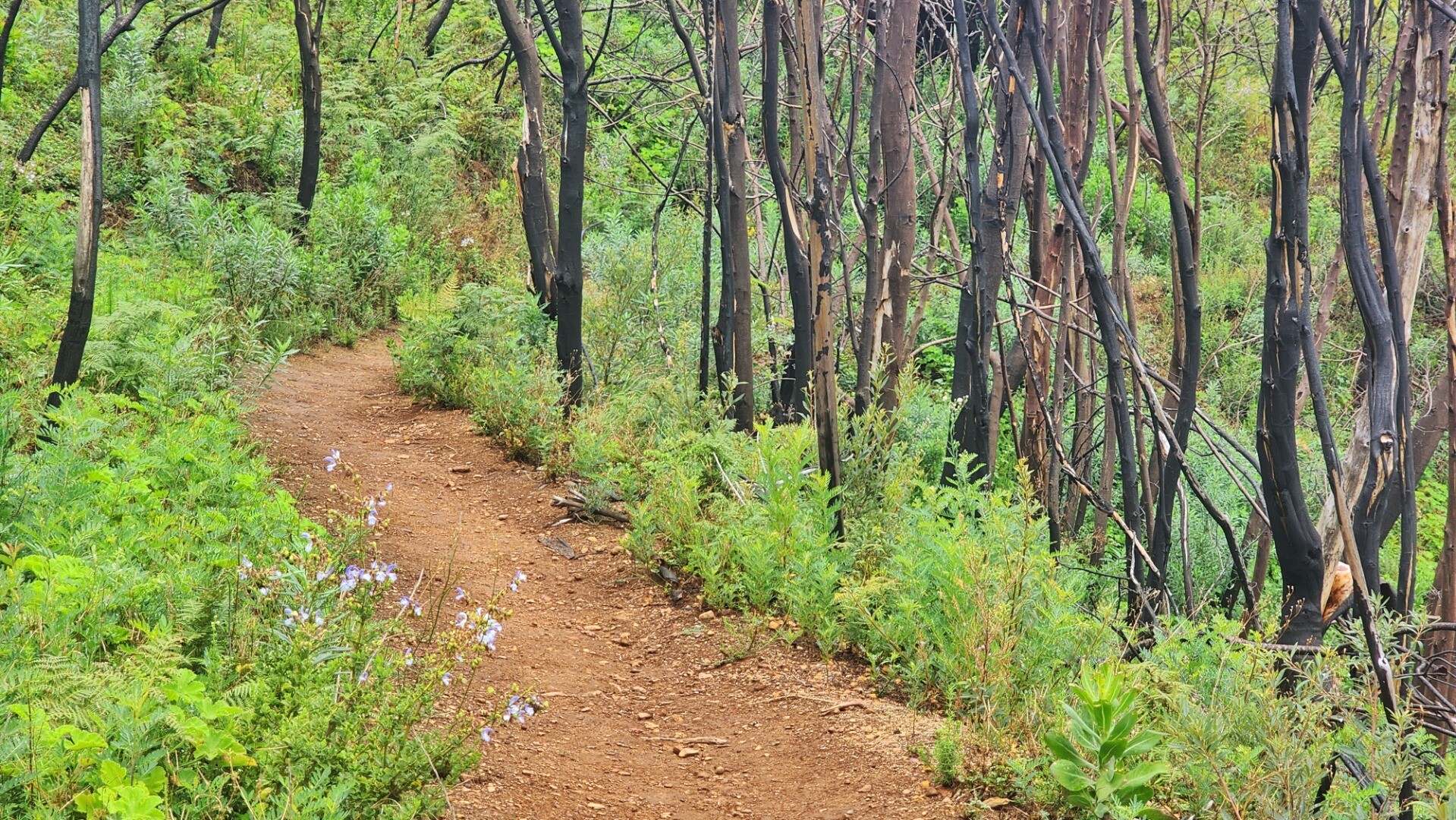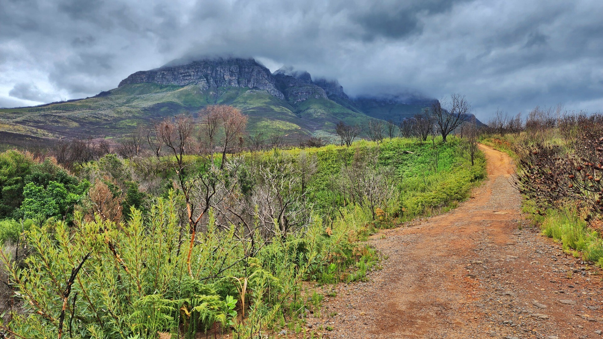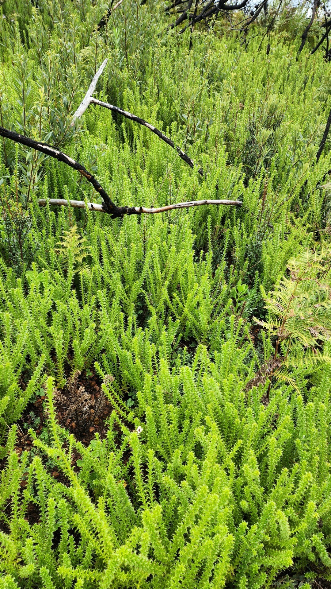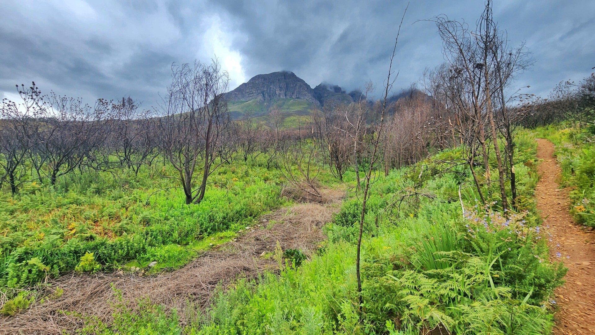 It was pretty cool seeing the black burned trunks agains the bright new growth. A lot of the new bushes are proteas that will grow to replace the burned ones.