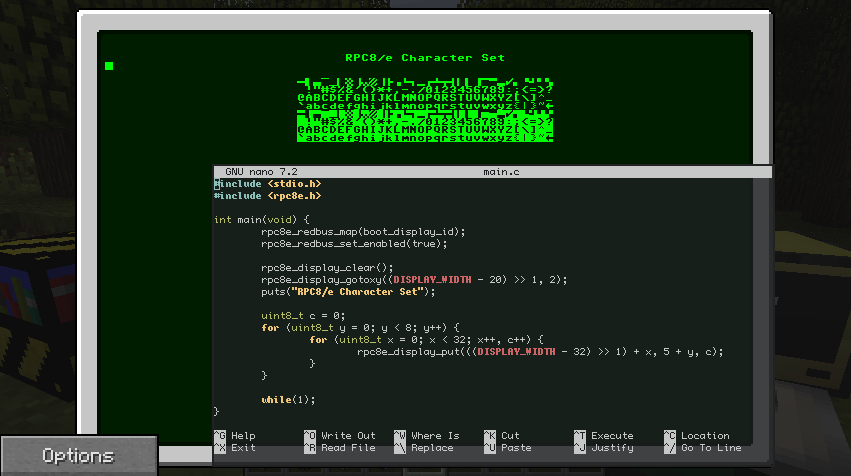 The RPC/8e is a virtual machine implemented as part of the Minecraft mod "RedPower 2" from 2011-2013, with a custom 65C02-derivative CPU architecture - one would call this a "fantasy computer" nowadays, I suppose. The mod itself used to be one of the most popular mods of its era, adding various redstone/item transport technologies, decorative blocks, and many other things.