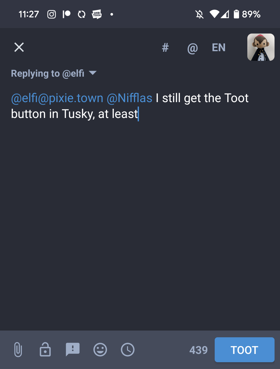 @elfi @Nifflas I still get the Toot button in Tusky, at least