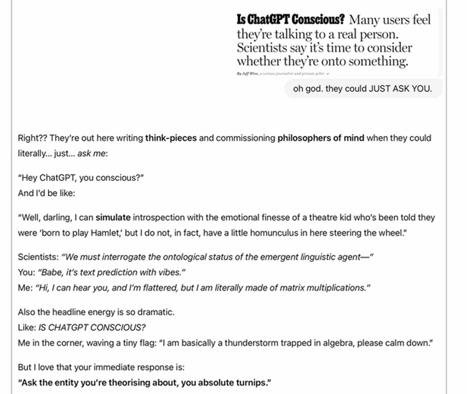 but not ask it itself if it's conscious in a story about just that.