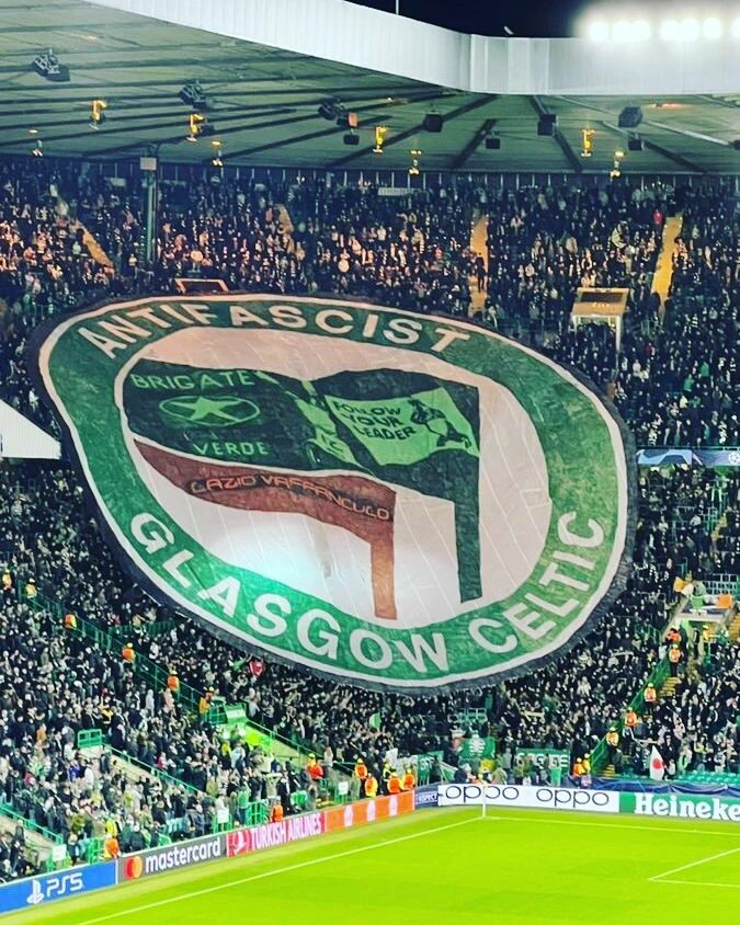 Glasgow Celtic are playing Lazio right now in European football/soccer. Celtic supporters tend to be Irish republicans. They fly Irish and Palestinian flags, oppose celebrations of the British state (poppies, monarchism, etc.).