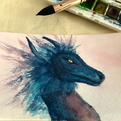 Profile image description: a watercolor painting of a person with pale skin and brown and blue hair laughing. They have a side cut and an audio processor is visible behind their ear. The art style is loose and the eyes are squinched into little crescents.