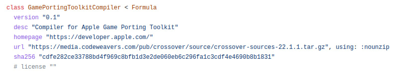 @thufie@social.pixie.town That specific URL is, in fact, a compiler. It builds a version of Clang/LLVM bundled with CrossOver. There's another Ruby formula (3.5MB, as it includes a lot of patches) which builds the actual Toolkit.